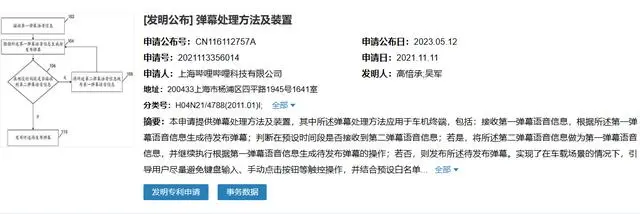 5 月 14 日消息,上海哔哩哔哩科技有限公司申请的“弹幕处理方法及装置”专利公布,实现了在车载场景的情况下使用语音发布弹幕。