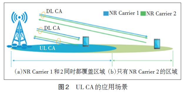而对于上行载波聚合 UL CA 技术,只有同时存在FDD 和 TDD 2 个 NR 载波且覆盖都较好的区域,才能采用 UL CA 来提升频谱利用率,如图 2 中的区域(a)。而在只有 1 个载波覆盖的区域,如图 2 中的区域(b),上行链路仅使用 NR carrier 2 进行通信。