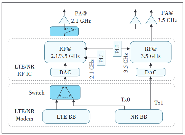3GPP R16 标准中引入上行发射通道切换的机制(Uplink Tx Switching),即一个发射通道固定给载波 2 使用,另一个发射通道在载波 1 和载波 2 之间切换,在 TDD-NR 载波上最大限度保留上行双流能力,达到最大化利用多个频谱资源的目标。上行发射通道天线切换是指终端在 SUL 和上行 CA 模式下通过时分切换 2 个物理天线在低频实现单天线发射,在高频实现双天线发射的功能。如图 3 所示,终端在 2.1 GHz 频段发射时切换到 2.1 GHz 天线端;在 3.5 GHz 频段发射时,终端将原本 2.1 GHz 的射频前端和数模转化切换到3.5 GHz 天线端,从而实现 3.5 GHz 双天线发射。该功能在 SUL 和上行载波聚合的时分发射模式下实现在近、中点大幅提升用户上行吞吐量。在上行业务需求比较大的 2B 场景有非常大的应用价值。