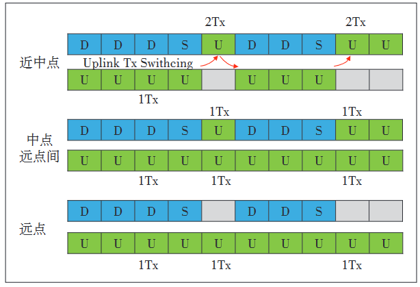 a)在近中点,即 3.5 GHz 和 2.1 GHz 的覆盖都相对较好,此时可实现 3.5 GHz 和 2.1 GHz 的 TDM 发送,即在 3.5 GHz TDD 上行时隙 ,终端的双发全部用于 3.5GHz 上行 2×2 MIMO 传输,而在 3.5 GHz TDD 下行时隙,则终端立即切换到使用 2.1 GHz FDD 进行上行传输,这种快速切换机制不但使得上行方向可用时隙提升到接近 100%,而且不牺牲 TDD 2×2 MIMO 能力,提升上行容量,获得大带宽和低时延能力。