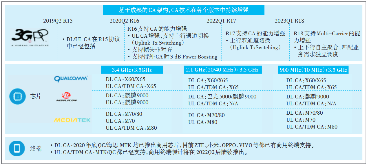目前主流设备厂商基本已支持 3.5 GHz 和 2.1 GHz的 UL CA 和 UL Tx Switching 功能,并在实验室或外场开展了功能性测试。3.5 GHz 和 Sub 1 GHz 的时频双聚合功能,在 2022 年 Q3 实现。对于芯片和终端而言,目前高通、MTK、海思等芯片厂商均支持。已有商用终端支持 DL CA,而上行载波聚合及时频双聚合在 2022 年 Q2 后商用终端逐步推出(见图 5)。