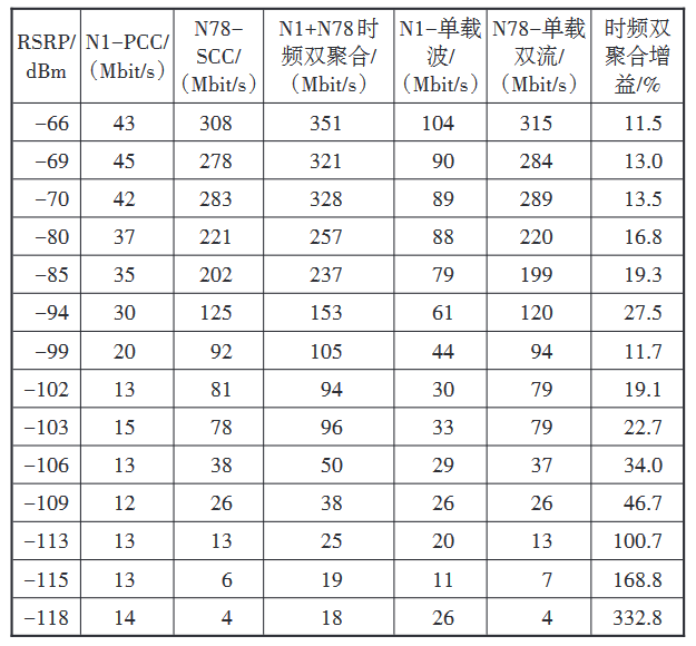 c)若以上行边缘速率门限为 25 Mbit/s 为例,3.5GHz 单载波对应的 RSRP 约为-109 dBm,采用时频双聚合技术对应的 RSRP 约为-113 dBm,相当于上行覆盖延伸了约 4 dB。需说明的是,因测试数据样本较少,此数据仅供参考。