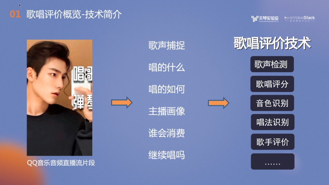以QQ音乐的音频直播流片段为例。一位QQ音乐音频主播,直播了一小时。获取到直播流后,我们通过歌声检测技术捕捉了音频主播直播中的歌声片段,并使用音频指纹匹配歌曲,判断主播的演唱曲目。接下来,歌唱评价技术会结合主播演唱的音准、节奏、气息、技巧及情感进行分析,并通过声线的分析建模主播的画像,同时实时向主播提供歌唱反馈。还可以使用算法预测可能会喜欢这类声音的用户。这里会运用到很多歌唱评价的相关技术,例如歌声检测、歌唱评分、音色识别、唱法识别,歌手评价等。