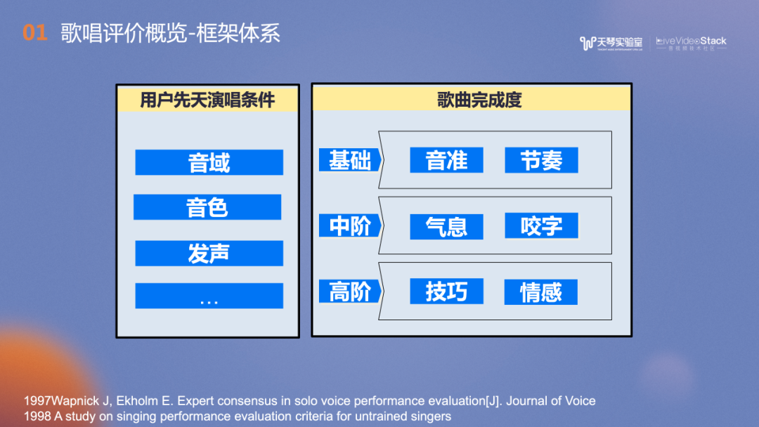 上图展示了我们参考文献和实际经验,搭建的歌唱评价体系。分为两个方面,一个是用户维度,一个是歌曲维度。用户维度和用户本身的特性相关,如音域、音色及发声,是相对稳定的评价维度,通过日常练习可以得到改善。歌曲维度则更偏向于歌曲本身,和用户本次演唱的表现有关,例如如基础的音准、节奏;中阶的气息、咬字以及高阶的技巧、情感。我们也逐一进行了技术实践。