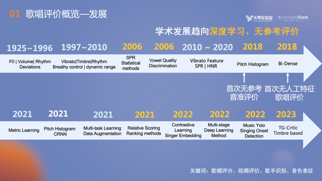 在学术研究领域,与其相关的关键词包含歌唱评分、视唱评价、歌手识别及音色表征等,都是音频/音乐内容理解相关子领域。纵观歌唱评价技术发展,最初的研究常常使用基频、响度及颤音等特征,随着时间的发展,无参考评价、深度学习技术使用的越来越多。