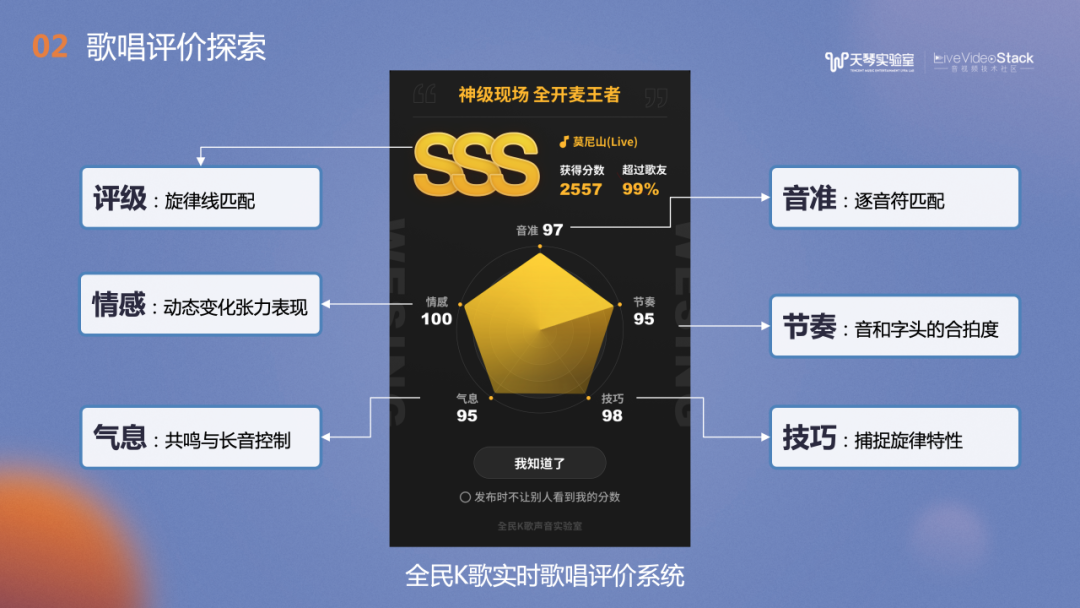 图中是全民K歌的打分面板,分为两部分:上方的“SSS”是评分等级,是全民K歌打分1.0的算法,主要是用户演唱旋律线与模版的匹配度评级,受到广大用户的喜爱。下方的五边形是2.0算法的五维打分图,每个顶点是各个维度的评分,包括音准、节奏、技巧,气息和情感,都是实时计算完成的。各个维度都是主要基于有参考评分的思路实现的。