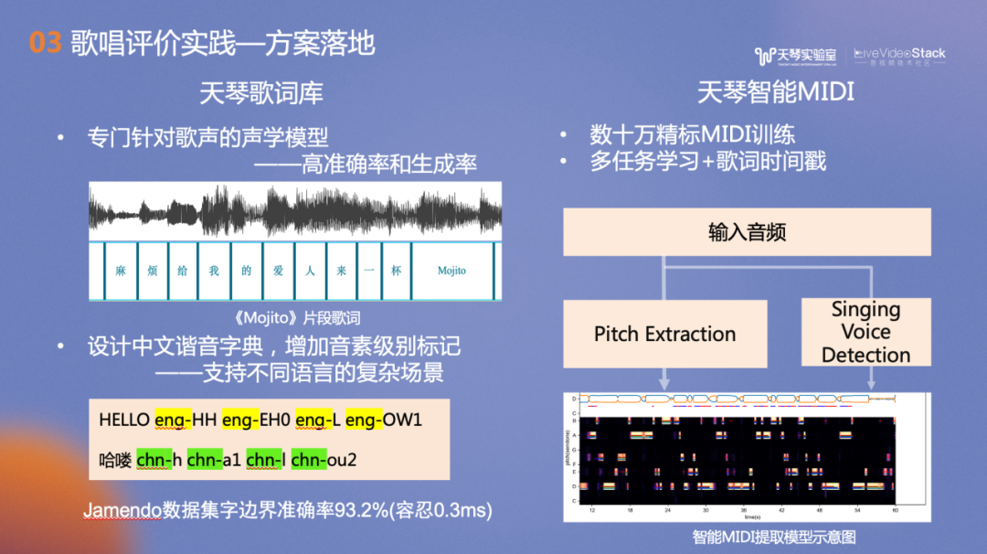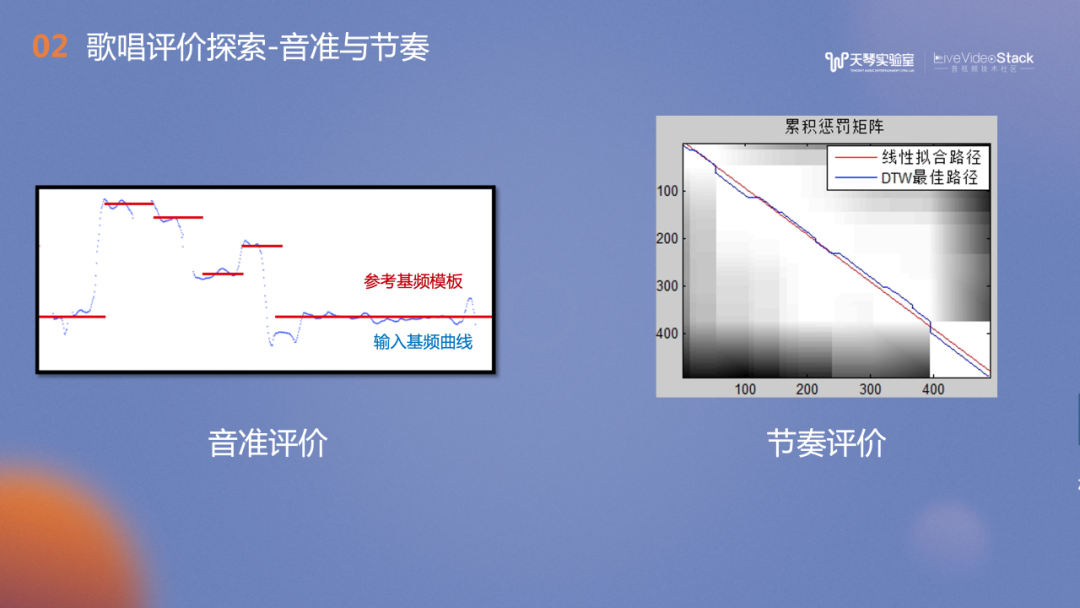 在音准评价,我们提取用户演唱的旋律线——基频,并和曲谱模板MIDI进行匹配与评分。在设计算法时需要考虑许多细节,例如音和音之间的过渡的滑音及字尾的颤音。虽然这些细节可能与模板不匹配,但它们是演唱风格的体现之一,也是用户演唱能力的表现。右侧的节奏评价较常见的做法是旋律线与MIDI的动态规划匹配,我们也实现了用歌声ASR技术判断歌手唱的每个唱字时间点是否与歌词匹配。