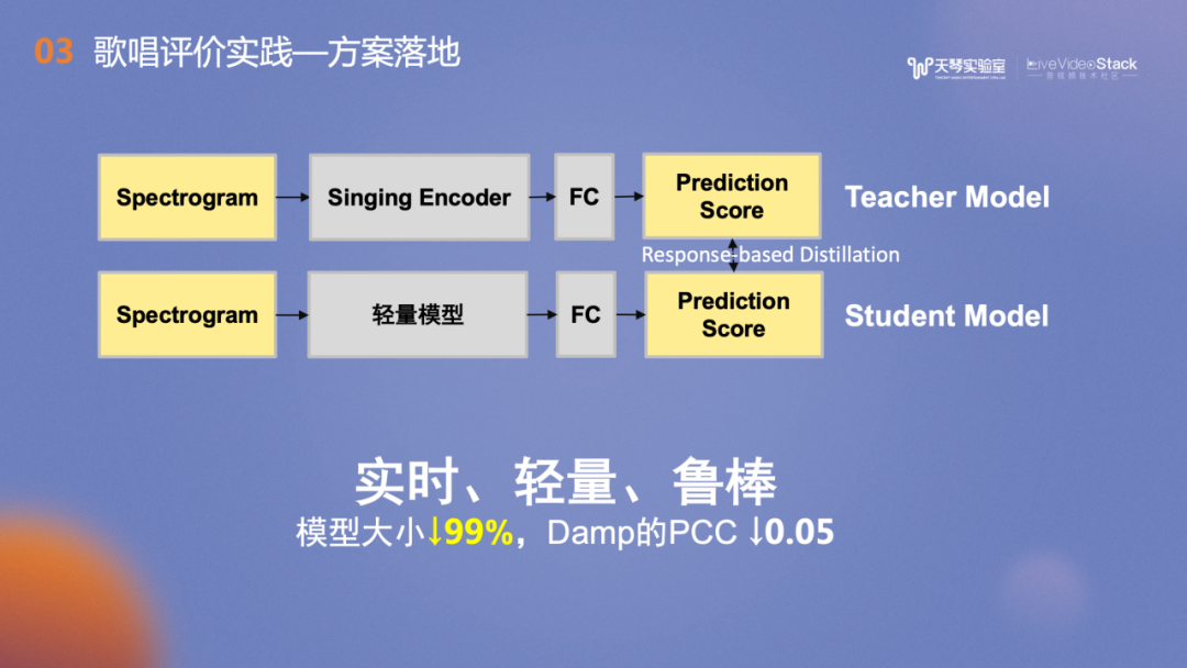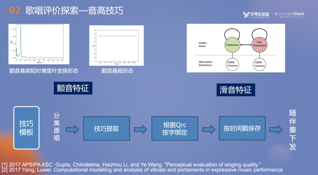 技巧评价的范围比较广,我们主要实现了音高和发声技巧的评价,接下来将重点介绍音高方面的技巧。我们会捕捉用户在演唱过程中的旋律特性,如旋律中的颤音及滑音特征。如何评价用户的技巧水平?颤音是否越多越好?类似的,我们会参考原唱进行评分。提前对分离的原唱进行技巧特征的提取,再根据歌词按字绑定,在唱歌教学场景,系统会提示用户原唱的某些字需要颤音或滑音,然后按照时间戳进行保存,随着伴奏下发。当用户在歌曲特定时间点演唱出了技巧,他会得到相应的分数。