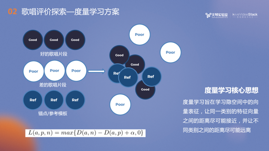 度量学习的主要思想是学习“好声音”的共性,以及和“不好声音”的差异性。图中左上角深蓝色部分是好的歌声片段,下方白色是差的歌唱片段。我们会选择一个锚点作为参考歌唱片段,一并汇入模型,让同一类别的特征向量之间的距离尽可能接近,并让不同类别之间的距离尽可能远离,以此来训练模型。