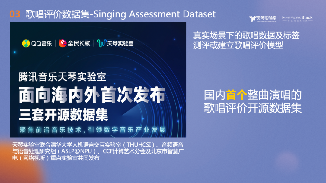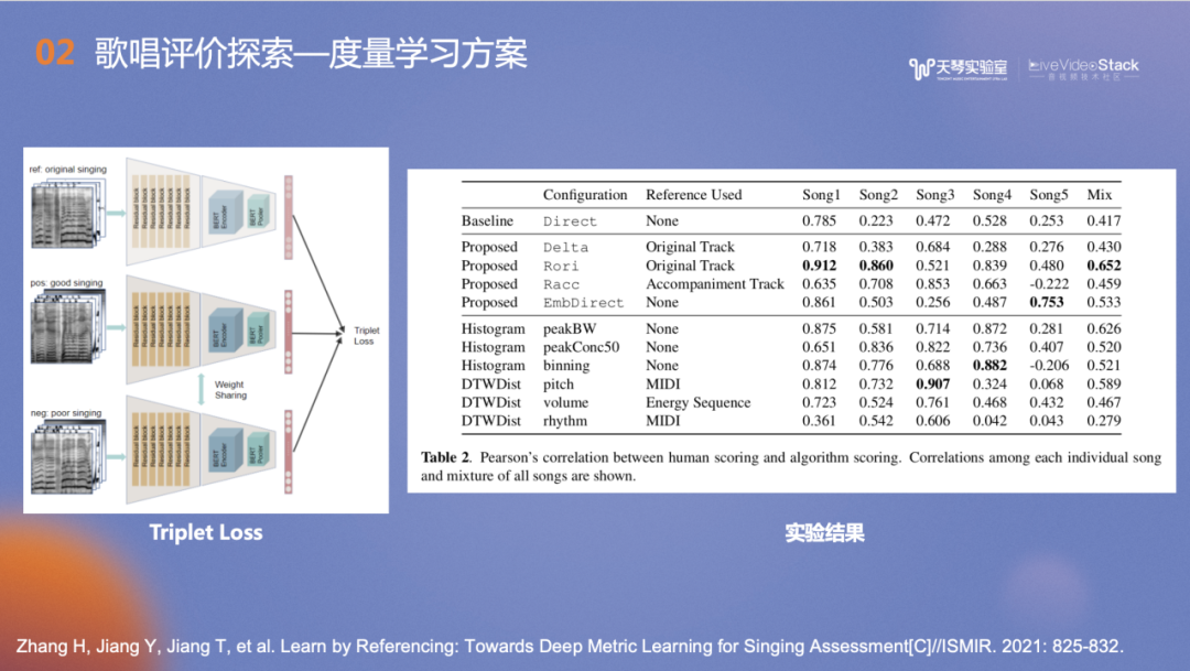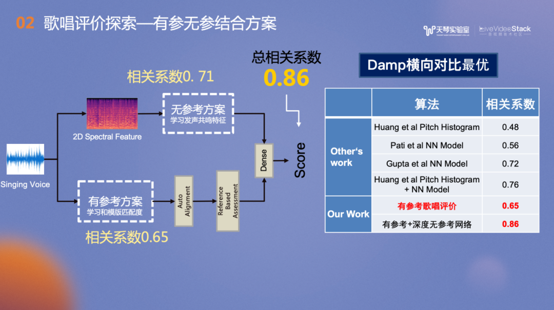 右侧是Damp数据集和以往的学术界工作的对比,有参考歌唱评价达到了0.65的相关系数,结合有参考和深度无参考的网络,相关系数达到0.86,优于于Baseline在Damp数据集上的0.76相关系数。