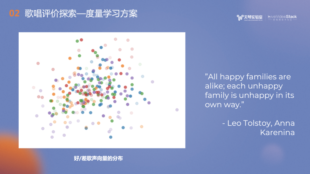 图中是学习得到的音频音色向量在二维空间中的分布,深色的点代表好听的歌声,浅色的点代表较差的歌声。可以看到深色的点呈聚集状,而浅色的点则较为分散,这和我们训练度量学习的Loss相关的。图案的分布不禁让我们想到托尔斯泰的一句话,“All happy families are happy alike; each unhappy familiy is unhappy in its own way”。在声音是否好听方面也类似:好听的声音是有共性的,但不好的声音各有各的缺点。