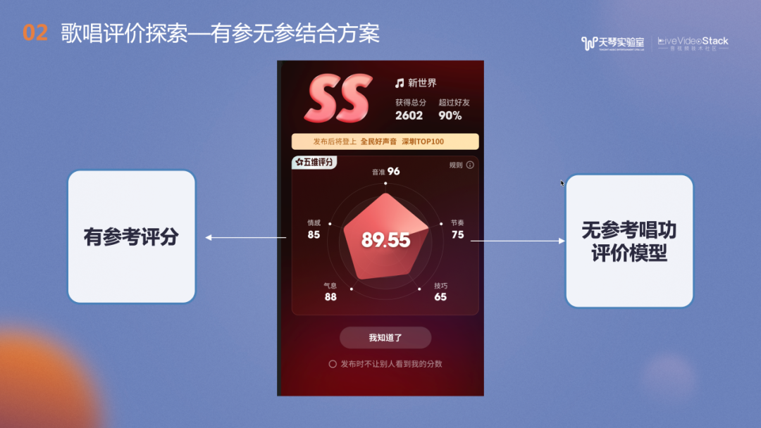 于是我们进一步优化模型,升级了打分技术。希望通过无参考评价的方法可以脱离模版的约束,捕捉高唱功的表现,并对其进行打分。