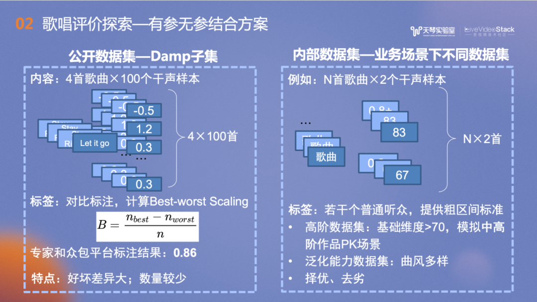 右侧是我们自己搭建的内部数据集,每首歌包含了两个不同演唱者的作品,每个作品的音准分都在70分以上,希望在构建的是“高阶”演唱用户的数据集。每个标注人员都有一定的音乐学习背景,在标注时提供了为标注人员不同粗区间的标准,每首歌的精细化评分由标注人员来把握。