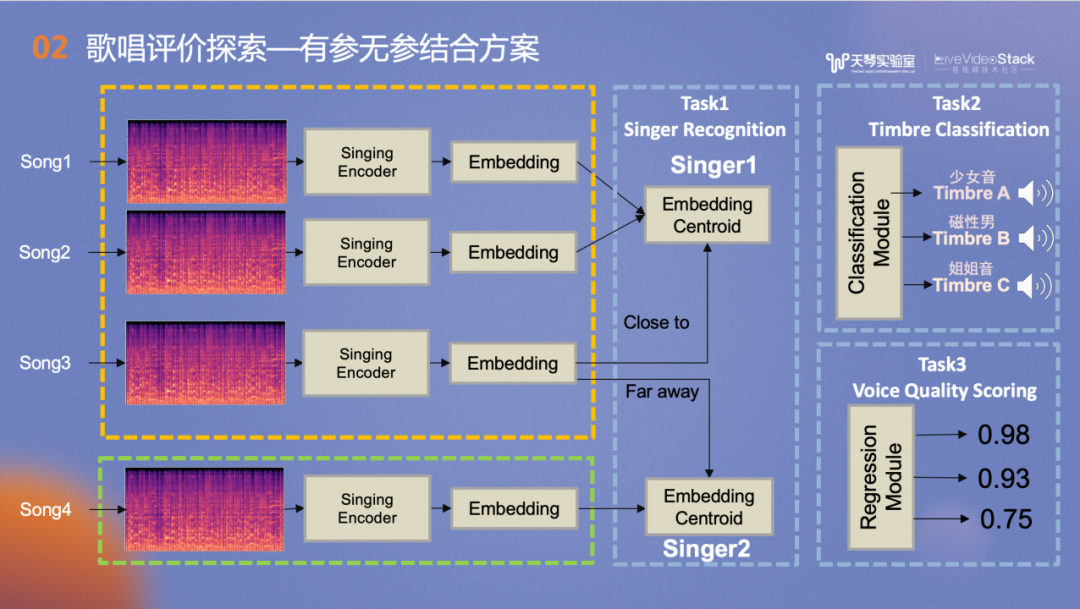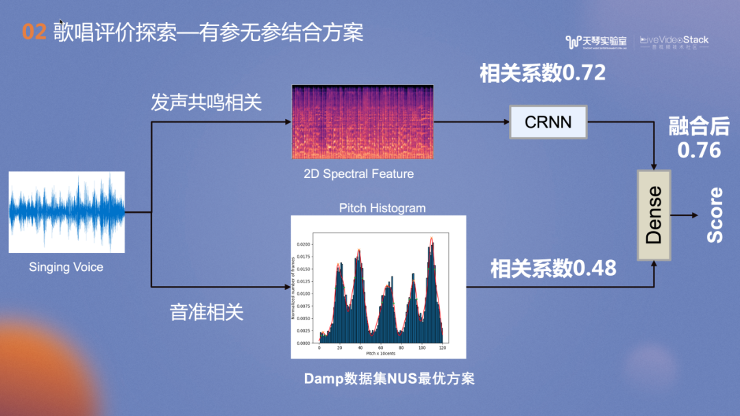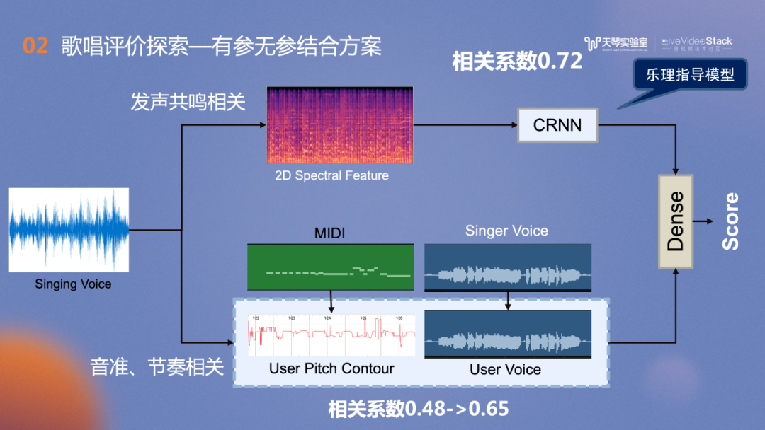 对音准节奏相关分支的改造,我们借助了TME非常丰富强大的曲库资源,优化为有参考的评价方案,在此分支的相关系数从Baseline的0.48提升到了0.65。对发声共鸣分支的改造思路是:高阶演唱中,我们关注的是是否有真假音转换,在不同发声之间的切换或声音的控制。此时,高阶用户的评价更和音色控制相关。因此我们借鉴了歌声音色的相关模型训练思路。