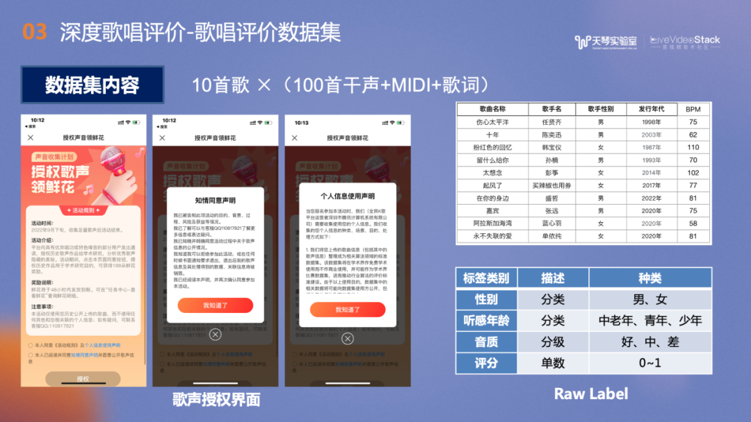 目前我们收集了10首歌,每首歌有100个干声,并附带其MIDI和歌词句级别的时间戳,希望为学术界或工业界提供帮助。右下角是我们提供的粗略标注,包括性别、听感年龄、音质、噪声级别及最终歌唱评分。后续我们计划和高校合作进行精细化的歌唱标签标注,也就是审美相关的精细标注。