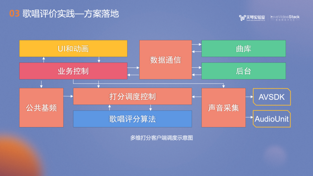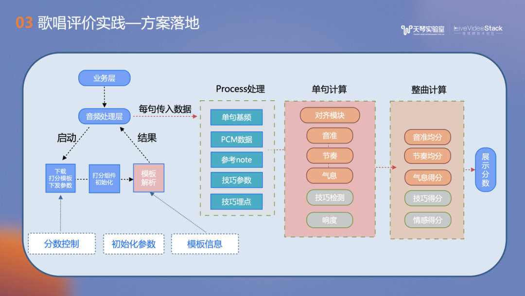 上图介绍了在K歌场景的流程框图,包括对声音进行采集、加载与下载模板,并进行初始化,采集每一句的音频相关特征PCM数据,进行单句得分计算以及整曲计算,最后得出歌唱评价分数。