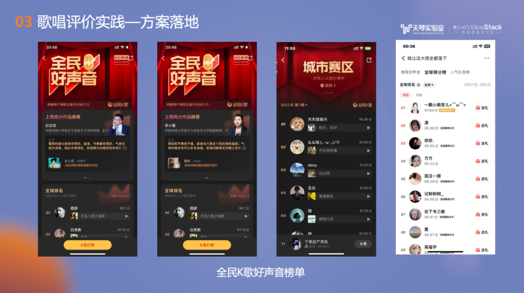 接下来为大家介绍一系列实践的具体应用。我们将最新升级的歌唱评价技术应用在了全民好声音榜单,在用户每次的演唱结束的同时会显示当前用户的地区排名及全球排名。榜单上的优质作品吸引和激励用户更多地演唱发布作品,进行打榜挑战。此应用上线后,用户的录唱行为有明显提升,3日留存和7日留存都有明显的上涨。