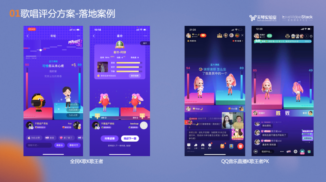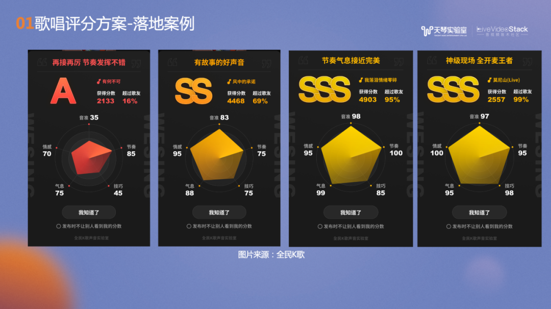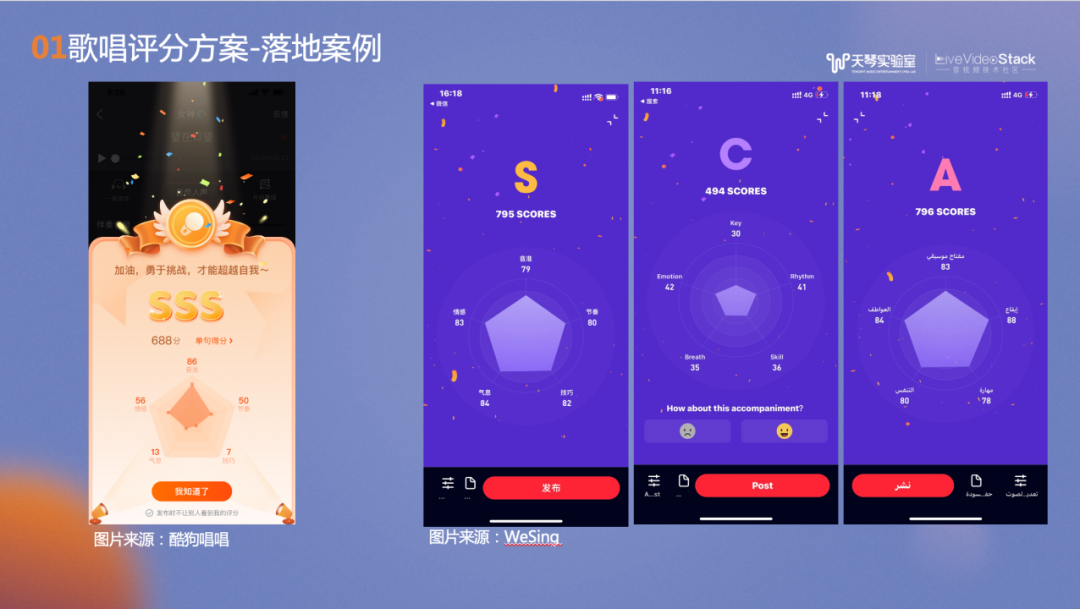 多维度打分功能已经作为了打分SDK对内外提供支持,上图是打分组件在酷狗唱唱、Wesing以及全民K歌的录唱落地应用。