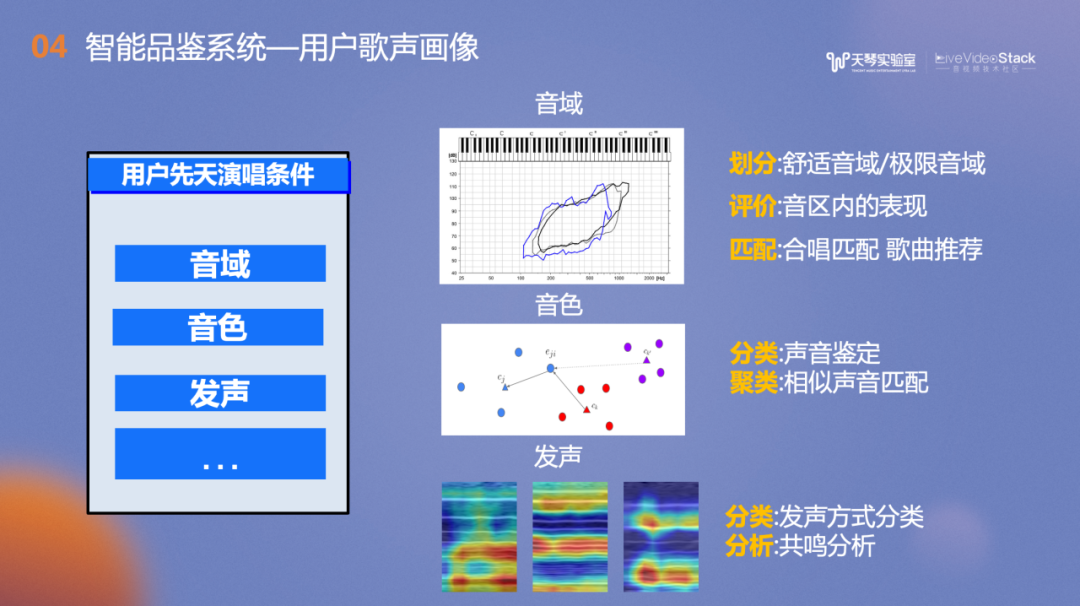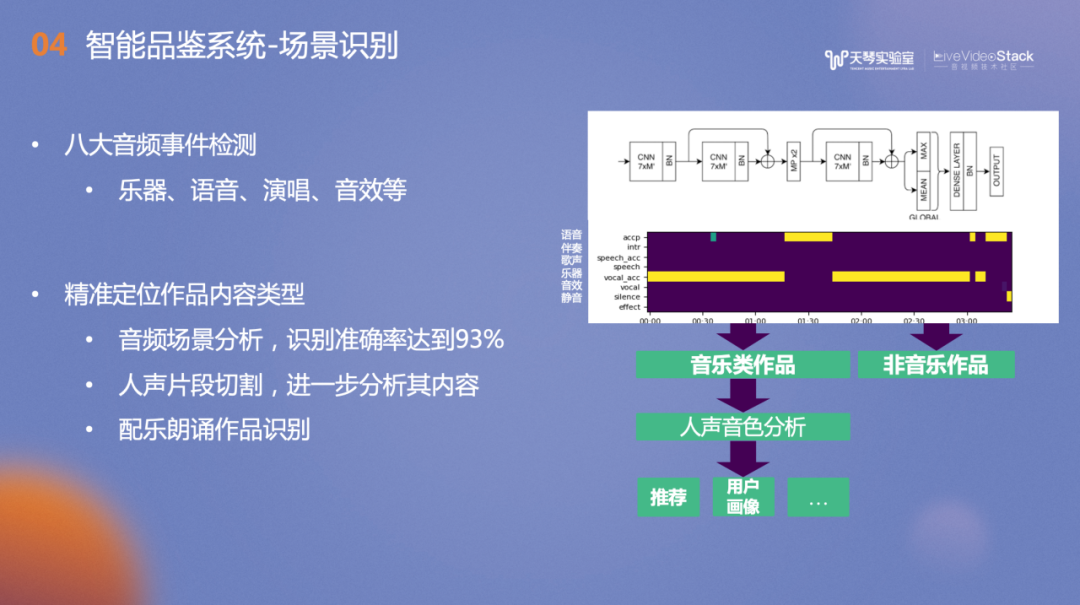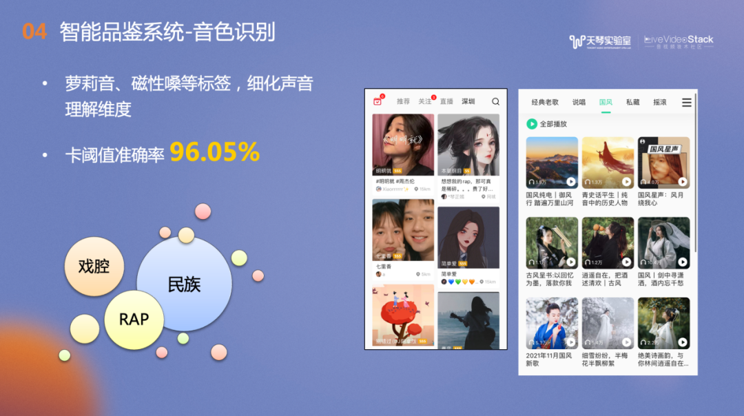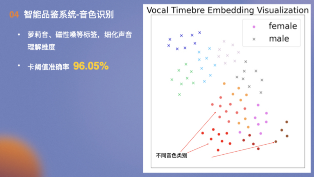 音色识别方面,结合平台的实际情况,对用户演唱的音色进行分类,卡阈值准确率高达96.05%。右侧是各种音色在二维空间的分布,左上角是男性的音色、右下是女性的音色以及在两种音色之间分布着中性的音色。