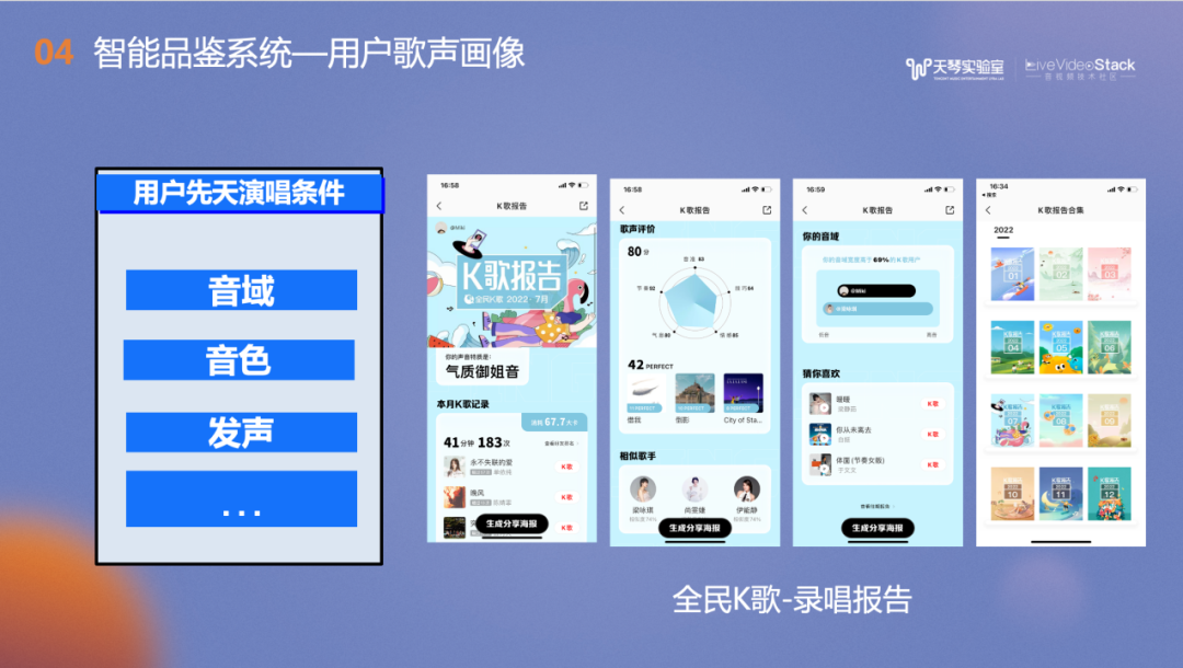 以上功能都已在全民K歌的录唱报告中落地,我们会基于用户这个月内发布的作品进行音频特征的汇总并在月度录唱报告上呈现,比如用户的嗓音标签、音色相似的明星、音域范围和喜爱歌手的对比图等,用户还可以通过反复的练习拓展歌唱评价的五维打分能力图。