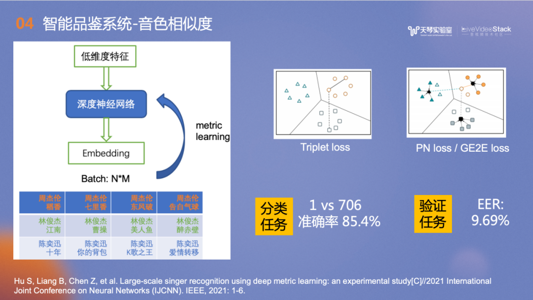 音色相似度计算中运用到的技术是分类任务和验证任务,在1v706的歌手分类任务中,准确率达到85.4%,EER是9.69%。