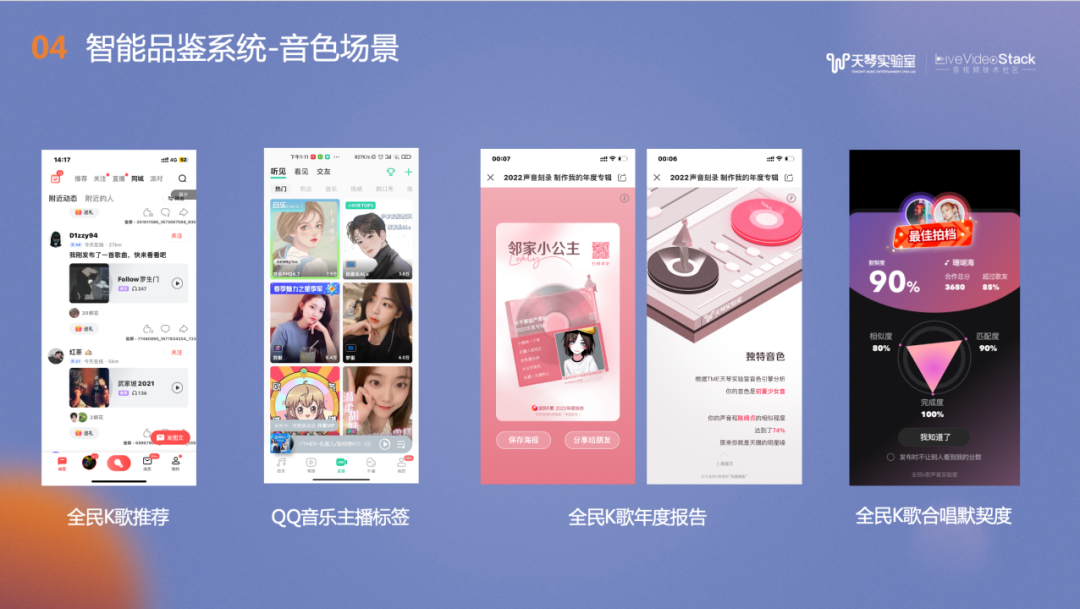音色落地场景很多,例如全民K歌推荐;QQ音乐主播标签;在全民K歌年度报告中,我们还结合的天琴实验室的图片生成技术,根据用户的声线生成音色画像;此外我们还可以根据合唱双方的音色匹配度进行音色默契度的评分。