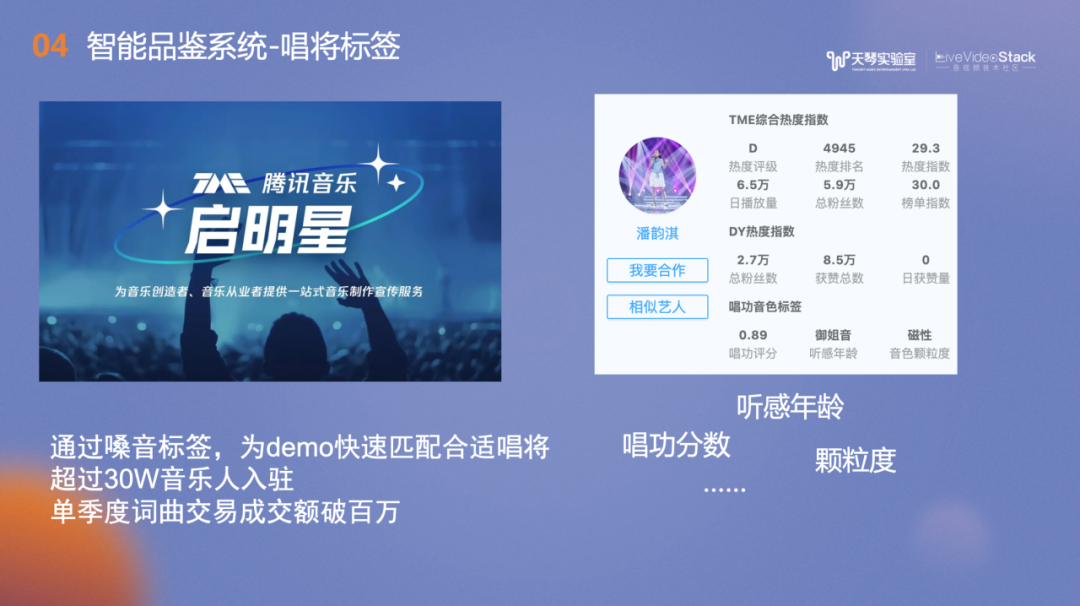 另一个音色标签使用场景是腾讯音乐的启明星平台,目前已有30w+的音乐人入驻,我们会对其中的唱将进行音色打标,用户可以在启明星平台进行交易,如上传demo,选择适配音色后演唱歌曲。我们根据上传的作品为每一位入驻音乐人打上音色标签,例如听感年龄、音色颗粒度及唱功分数,以便客户挑选心仪的演唱歌手。
