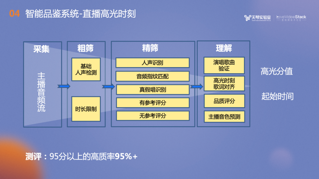 在直播方面,我们提供了直播高光时刻的识别功能,简单来说就是定位并裁剪出歌唱主播的演唱精彩部分。具体流程如下:对采集到的主播音频流进行粗筛,包括基础人声检测和时长限制,再进行精筛包括人声识别(一小时的直播中可能只有几分钟的有效歌唱片段)、音频指纹匹配(判断唱的哪首歌曲)、真假唱识别(判断是真唱还是播放的原唱),再进行唱功赏析。理解方面会校准歌词时间戳,为主播直播片段的音频品质进行评分,过滤掉大混响,或者背景噪声太大等影响用户听感的演唱作品。此外还输出主播音色标签、高光分值及裁剪出的高光片段,评测结果表明,高质率达到95%+。