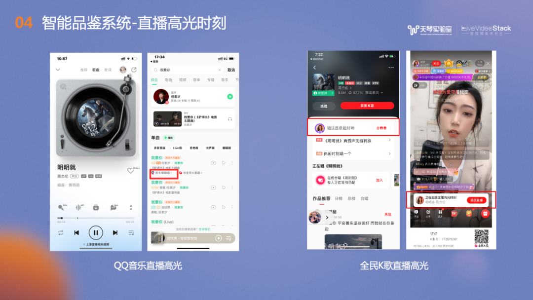 图片展示了直播高光时刻在移动端的显式入口,例如QQ音乐的播放界面、搜索界面。全民K歌的伴奏详情页以及推荐页。