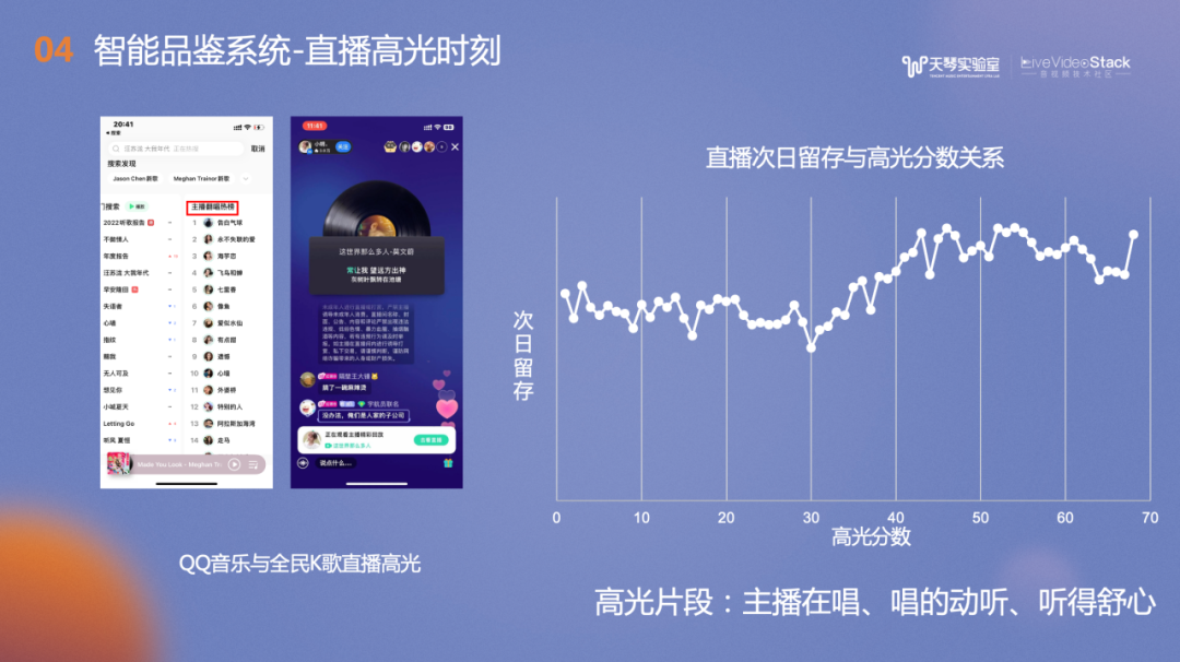 QQ音乐也根据品鉴得分建立了主播翻唱的热榜,异步展示了主播的高光片段作品,榜单按照综合得分排序。我们通过实验,计算了直播次日留存与高光分数的关系,可以看到高光分数在30分之后,次日留存率会随之显著提高。此外我们也结合视频分析的技术,为音视频直播的多模态智能理解做出贡献。