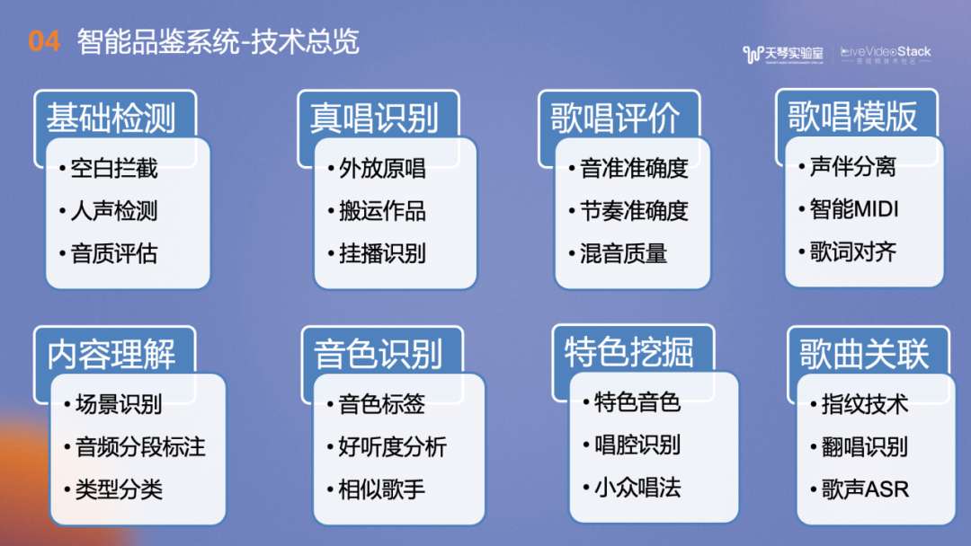 最后,再介绍下我们的智能音频品鉴系统。我们希望结合音频内容理解能力,对歌唱作品和音乐作品进行全方位的理解。