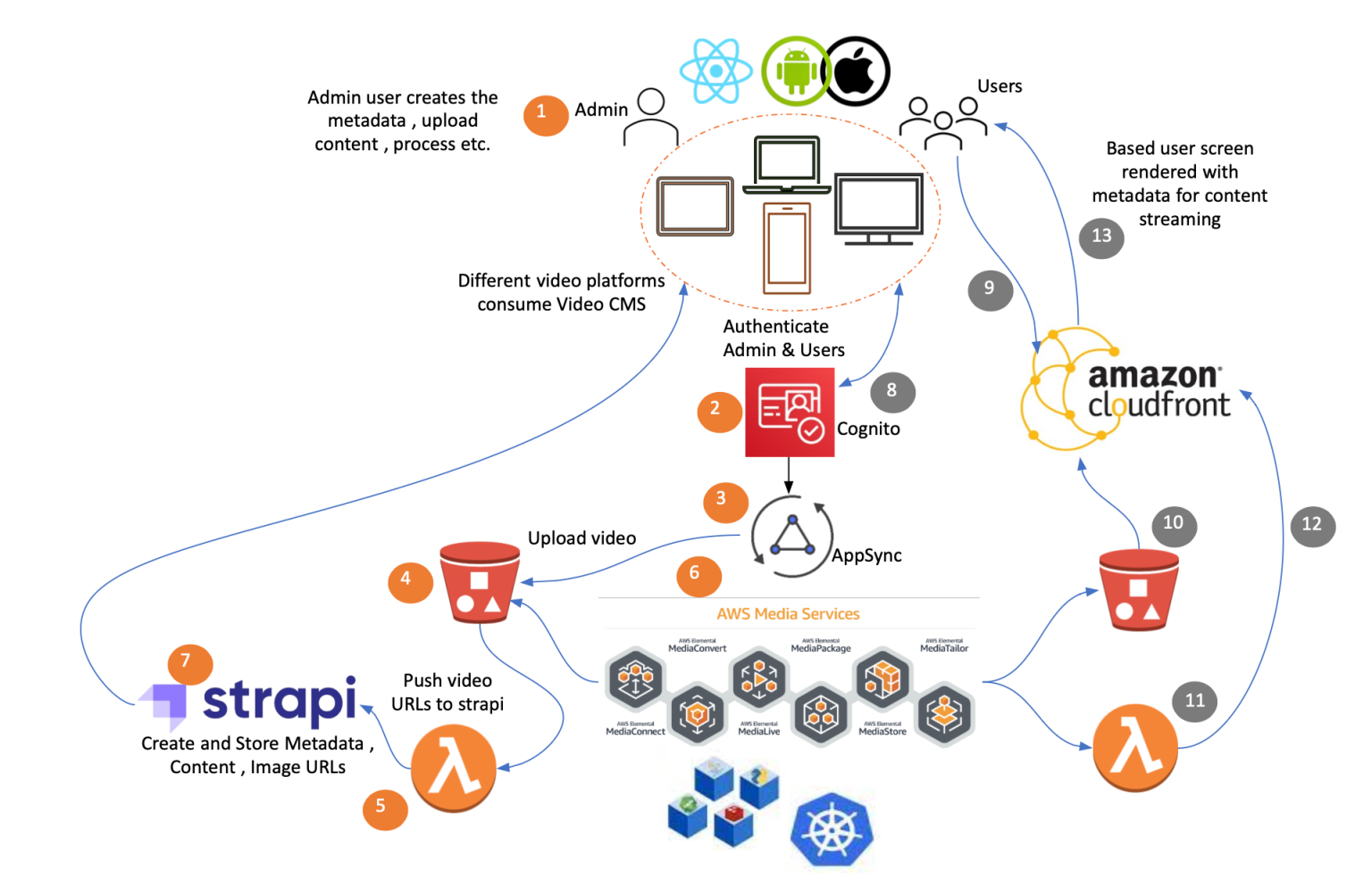 - 内容管理:基于应用程序构建,我们需要管理将通过应用程序交付的视频内容。它包括在内容管理系统 (CMS) 中上传和组织视频内容,以及为视频内容创建元数据,例如标题、描述和关键字。