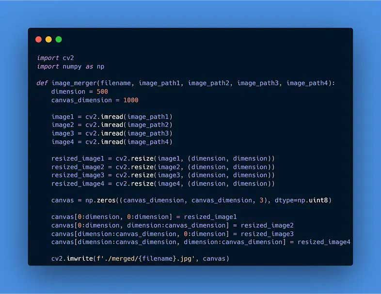 现在,我们将定义一个名为image_merger的函数,它采用五个参数:filename、image_path1、image_path2、image_path3和image_path4。这些参数表示输出合并图像文件的名称以及输入图像的路径。