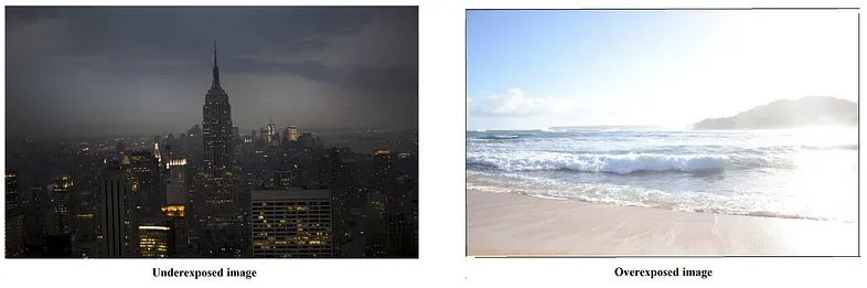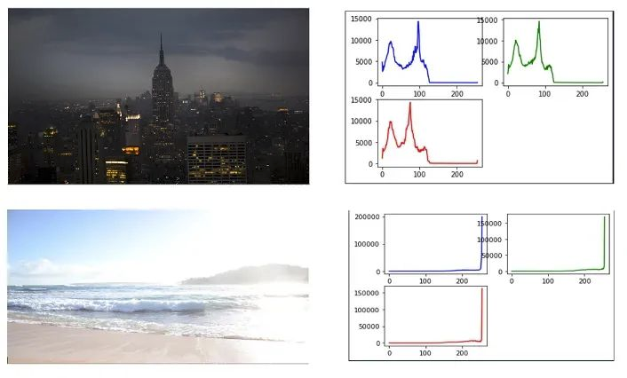 显然,一个直方图左偏,表示图像曝光不足,而另一直方图右偏,表示图像曝光过度。