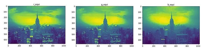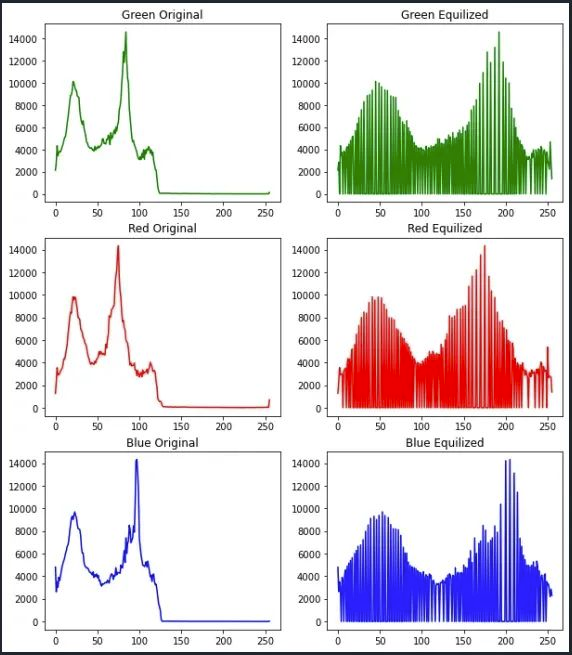 然后我们使用 cv.equalizeHist () 来均衡每个颜色层的直方图。使用 Matplotlib 和 OpenCV 将它们可视化。