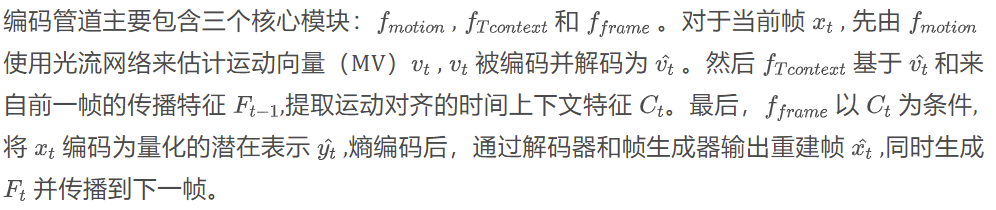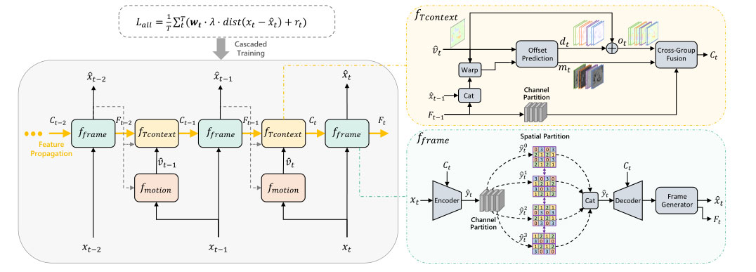 为此,本文建议指导 NVC 在培训期间学习分层质量模式。具体而言,本文为率失真损失中的每个帧添加权重 wt , wt 的设置遵循层次结构。在这种分层失真损失的支持下,周期性地生成高质量输出帧 xt 和包含许多高频细节的特征 Ft 。这有助于提高运动补偿(MEMC)的有效性,从而缓解许多其他 NVC 所面临的错误传播问题。此外,通过跨多个帧的级联训练,形成了特征传播链。高质量的上下文对后续帧的重建至关重要,它被自动学习并保持在长范围内。因此,对于 xt 的编码,Ft-1 不仅包含从 xt-1 中提取的短期上下文,还提供了从许多先前帧中提取的长期且不断更新的高质量上下文。这种多样的 Ft-1 有助于进一步利用跨多个帧的时间相关性,然后提高压缩比。