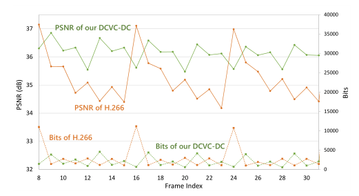 上图显示了本文的 NVC 的质量模式。可以看到,与 H.266 相比,本文的 DCVC-DC 以更小的比特成本获得了更好的平均质量。