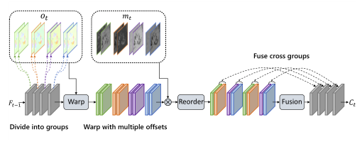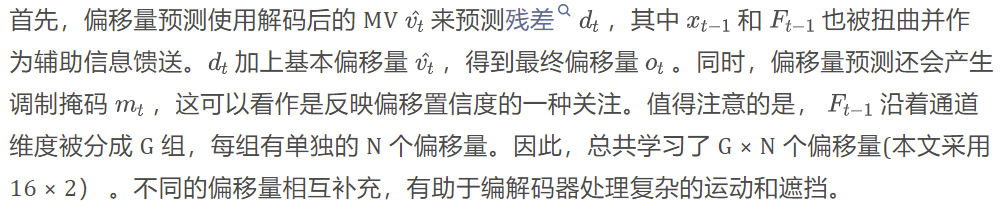 在大多数现有的 NVCs 中,fTcontext 仅是单个 MV 的扭曲操作。这种基于单一运动的对齐对复杂的运动或遮挡并不健壮。本文的 fTcontext 包括两个核心子模块:偏移预测和跨组融合。