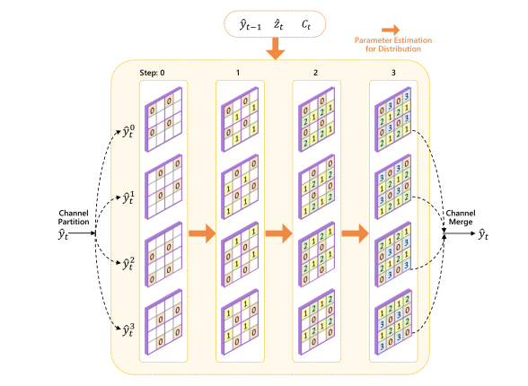 本文将 y^t 沿着通道维度分成四组,将每组在空间维度上划分为不重叠的 2×2 斑块。整个熵编码分为四个步骤,每步编码与图中相应指标相关联的不同位置。第 0 步,同时对所有斑块中索引为 0 的位置进行编码。对于四组,索引为 0 的位置是不同的。因此,对于每个空间位置,有四分之一的通道(即一组)被编码。在随后的第 1 步、第 2 步和第 3 步中,使用之前步骤中编码的所有位置来预测当前步骤中编码的位置的概率质量函数(PMF),并且在每一步中为不同的组编码不同的空间位置。