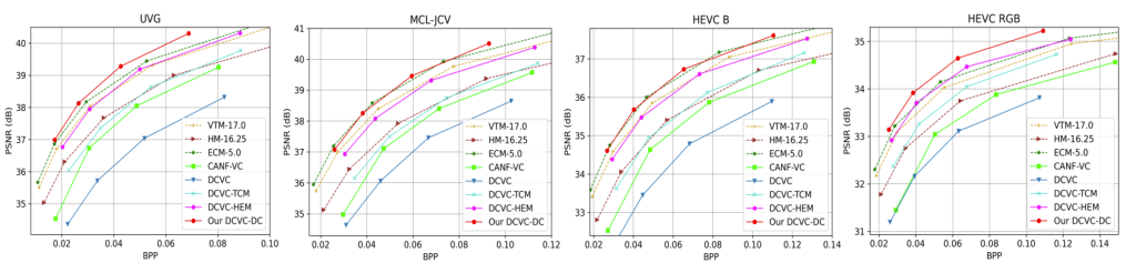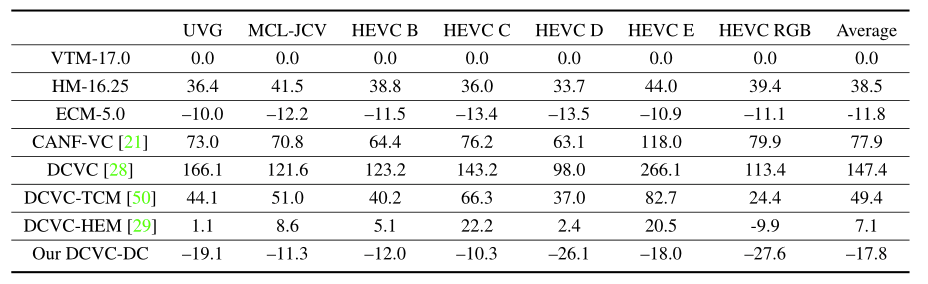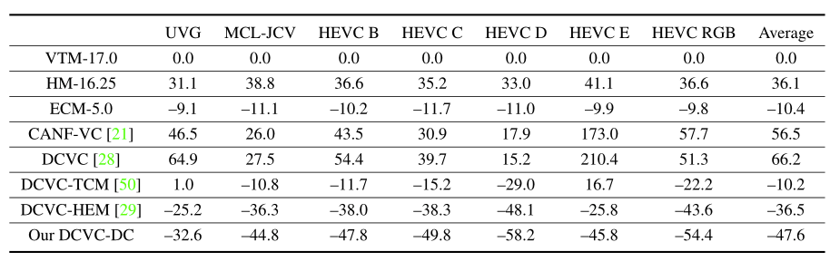 从率失真曲线中可以看出,本文的 DCVC-DC 在宽比特率范围内实现了更好的 SOTA 压缩比。