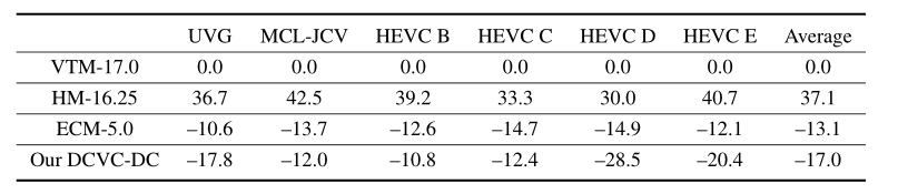 上表为 YUV420 视频在 PSNR 方面的 BD-RATE 比较。可以看到,DCVC-DC 比 VTM 平均节省 17.0% 的比特率。如果只考虑 Y 分量,平均可以节省 15.3% 的比特率。更好的是,DCVC-DC 在 YUV420 中的平均性能也优于 ECM。这是 NVC 发展的一个重要里程碑。