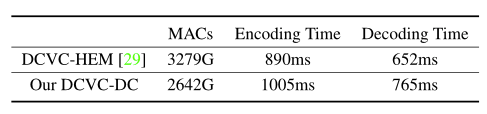 复杂度方面,本文的 DCVC-DC 的 MAC 比 DCVC-HEM 降低了 19.4% ,但实际的编码和解码时间更高。这是因为在相同 MAC 条件下,目前深度卷积的计算密度还没有正常卷积高。但通过定制化优化,可以在未来进一步加速。从另一个角度来看,考虑到 DCVC-DC 比之前的 SOTA DCVC-HEM 节省了 23.5% 的比特率,这样的运行时间增加程度是值得付出的代价。相比之下,ECM 比其前身 VTM 节省了 13.1%,但编码复杂度是 VTM 的 4 倍多。