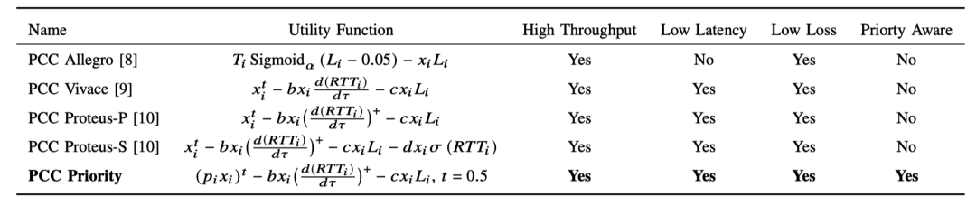 PCC将时间线划分为许多连续的监视间隔。在每个间隔中,PCC测量吞吐量、延迟和丢包率,并运行许多“微型实验”(即增加或减少发送速率)来最大化其效用函数。利用基于在线学习的速率控制方法,PCC能够有效地跟踪发送方的最佳发送速率。目前有四种不同的PCC变体,分别是PCC Allegro ,PCC Vivace ,PCC Proteus-P 和PCC Proteus-S。下表列出了这些PCC变体以及本文提出的PCC Priority的不同效用函数和特性。