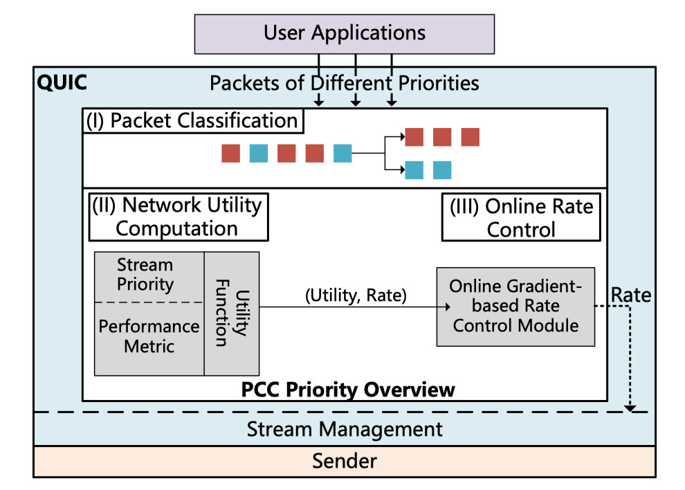 - 在线速率控制:PCC Priority使用此组件通过使用在线梯度下降法来调整发送速率并实现优先级感知的带宽分配。