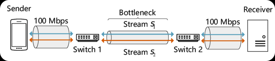 本文使用ns-3仿真来评估PCC Priority和其他带宽分配框架。为了评估,考虑一个情景,发送方通过连接两个交换机的瓶颈链路向接收方发起两个流,如下图所示: