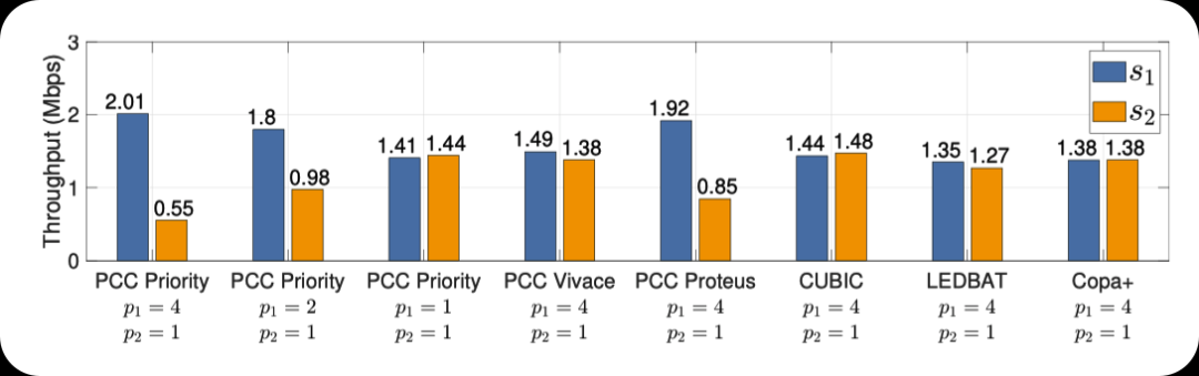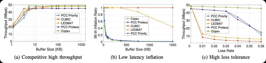 为了展示PCC Priority在吞吐量、延迟和丢包方面的高性能,本文测量这些指标并将PCC Priority与PCC Proteus、CUBIC、LEDBAT和Copa+进行比较。具体而言,实验包括使用单个流在基准50ms的RTT上和不同缓冲区大小下的50Mbps链路上进行几个100秒的数据传输会话。下图分别展示了不同协议在不同缓冲区大小的链路上的吞吐量,延迟膨胀比和在非拥塞丢包情况下的吞吐量。