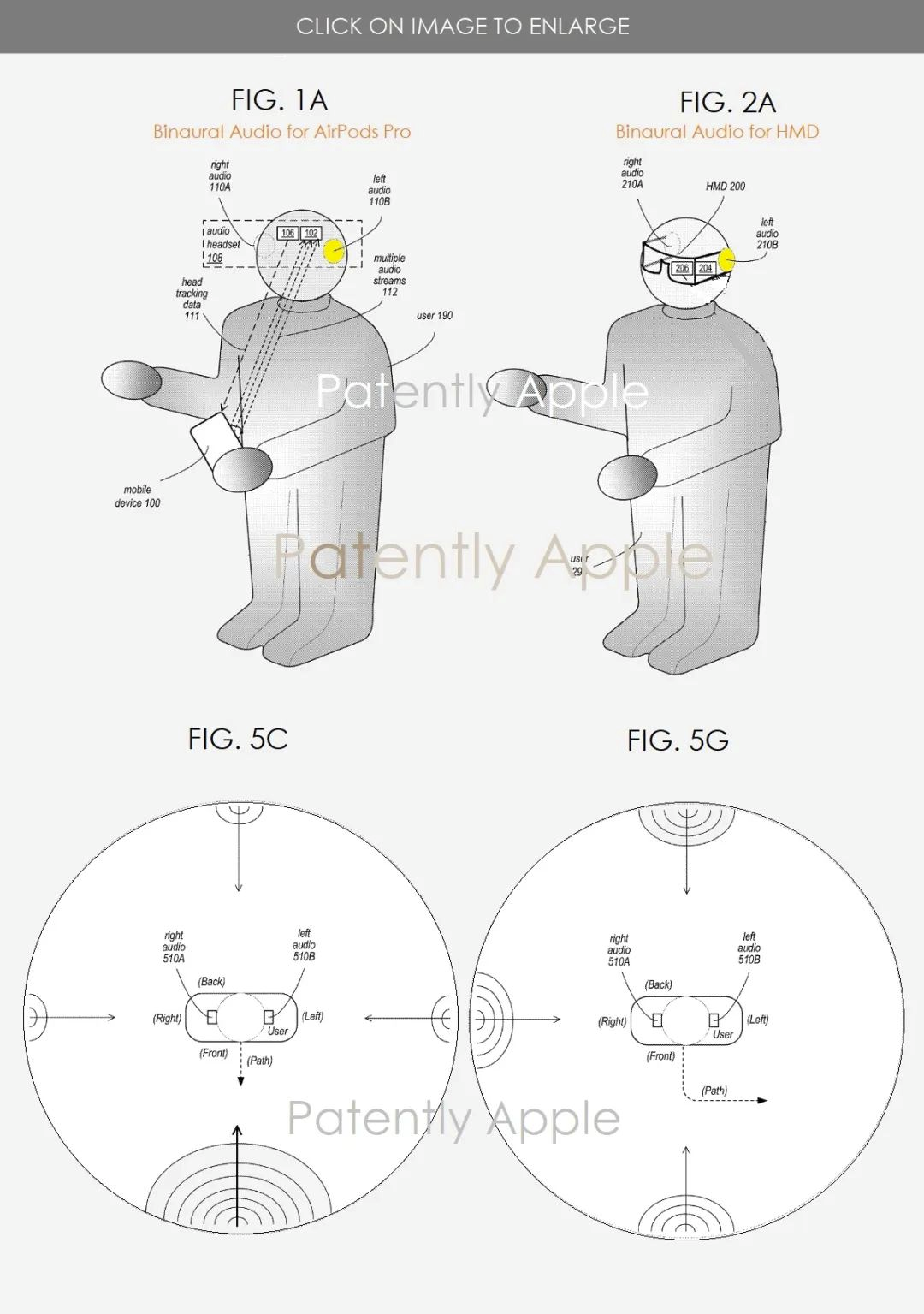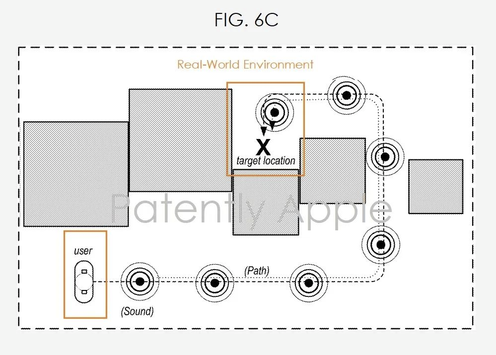 苹果授予的专利图5C和5G展示了空间音频导航系统可能使用的各种空间音频导航方法。苹果公司的专利图6C说明了一种离散路径追踪方法,其中声音沿着路径以离散间隔移动。在一些实施例中,当声音到达路径的终点时,它返回到路径的起点并重复该过程。