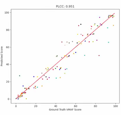 上图展示了每个视频的预测分值与 VMAF 分值之间的关系,横轴 VMAF 分值,纵轴是预测分值,不同颜色表示不同视频,相同颜色的不同点代表了 11 种不同的损失率(0.1%,0.5%,1%,…,4.6%,5%)。PLCC 结果为0.951,证明了模型的准确性,预测值接近 ground truth。