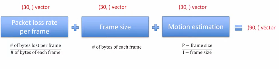 State 应该包含丢包损失和视频特性的相关信息。我们每秒(30 帧)对视频包流进行一次信息提取,包括每帧的丢包损失率、每帧的大小、运动估计,计算方式如下。