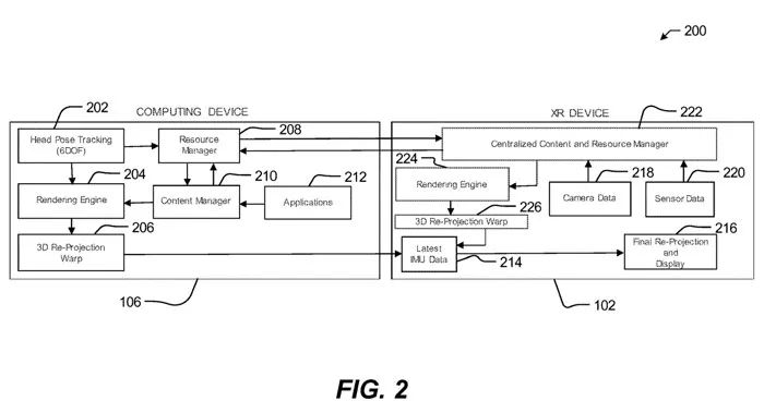 在一个实施例中给XR设备可包括集中式内容和资源管理器222,其可用于执行各种渲染工作负载管理技术,以在XR设备102向用户渲染和显示帧时减少处理能力、功耗和热影响。